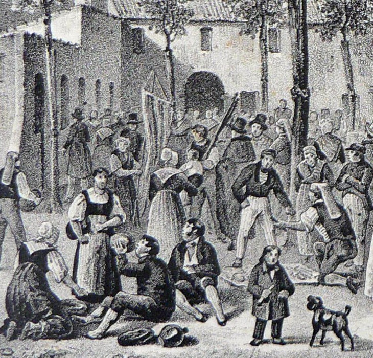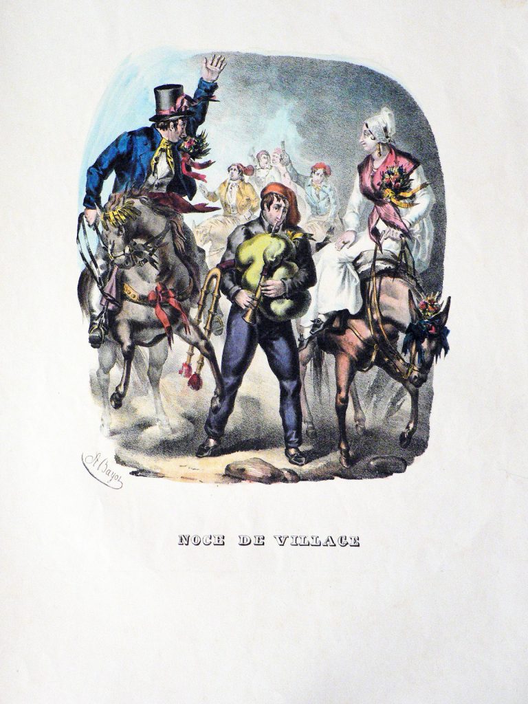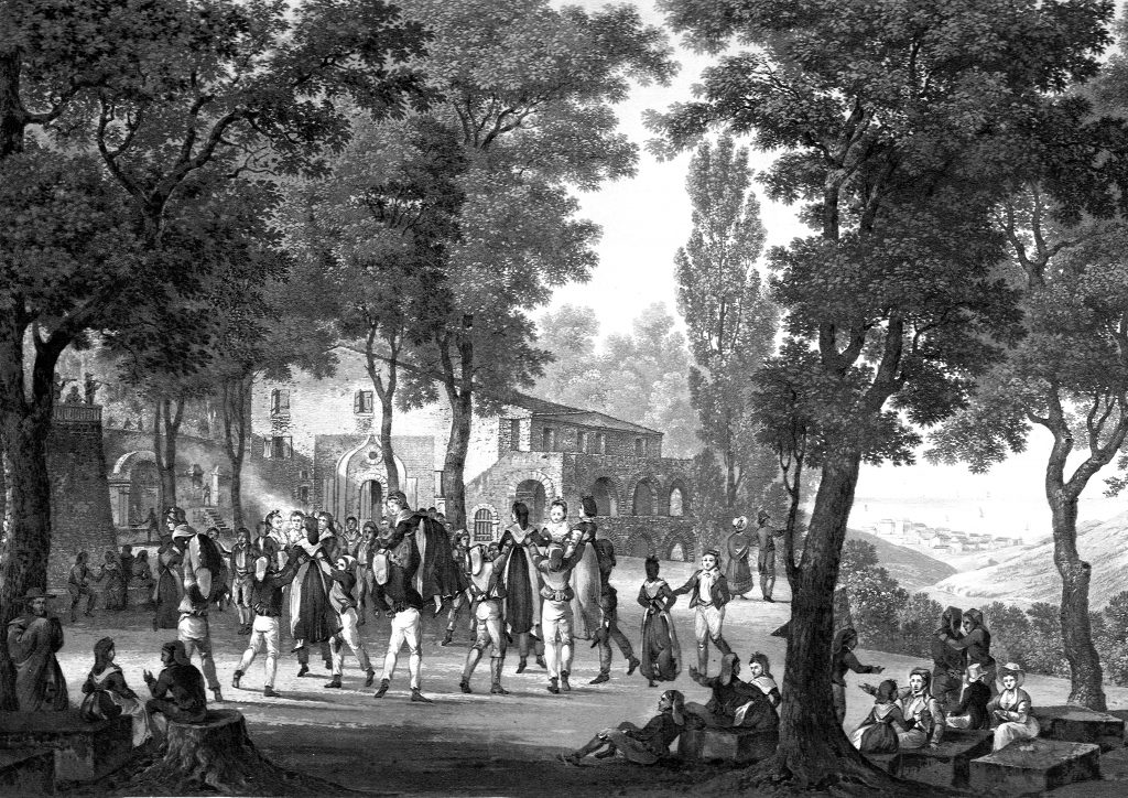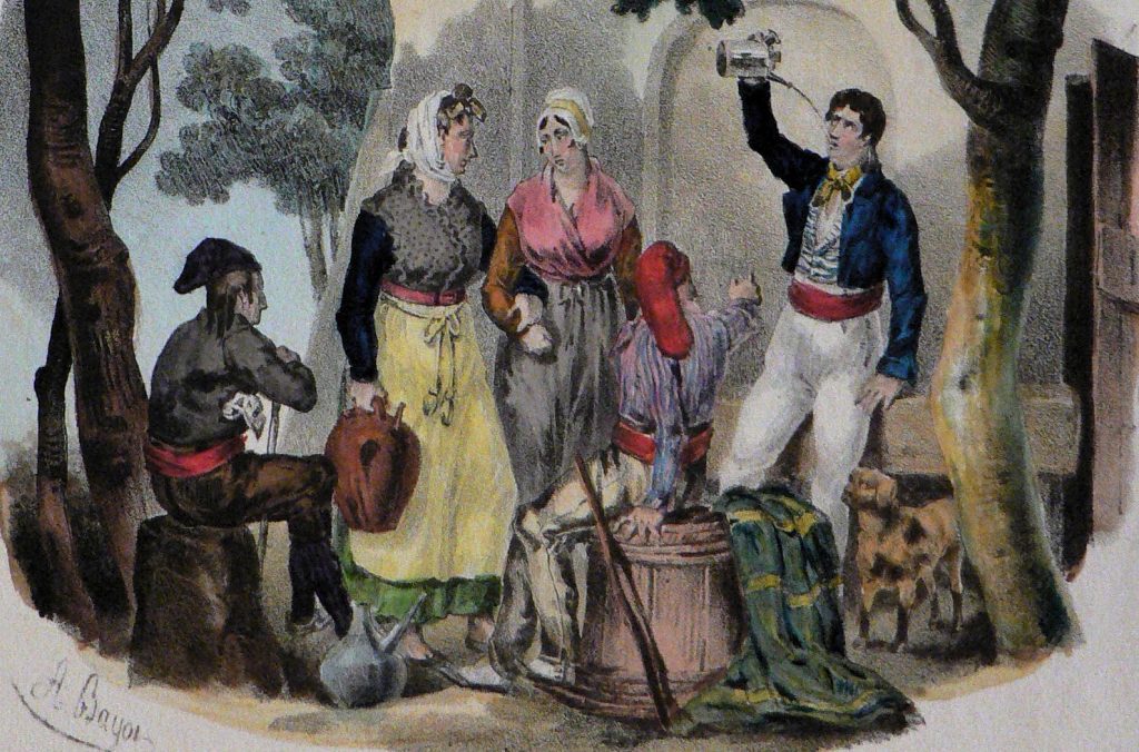 Les jeunes gens des meilleures familles, et même quelque fois les dames de la société, figurent dans cette danse: les premiers en veste et en bonnet catalan, les seconds en grisettes du pays. Le baill est une danse extrêmement gracieuse, qu’il faut voir pour la bien juger, qu’il est difficile de décrire, et qui n’est exécutée, avec perfection, que par les gens du peuple, surtout les femmes qui y déploient une légèreté et une désinvolture ravissantes. Les cavaliers font d’abord quelques pas en avant avec leurs danseuses, puis, se tournant subitement face à face, la dame se recule en décrivant une sorte de cercle, et le cavalier la suit en formant quelques pas, et en s’accompagnant des castagnettes, s’il est danseur par excellence.