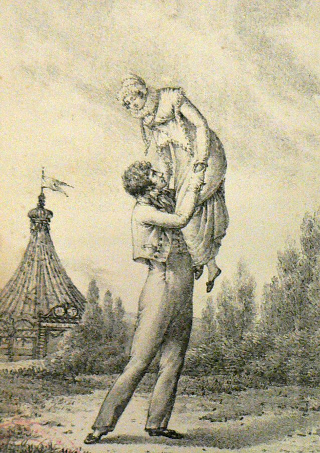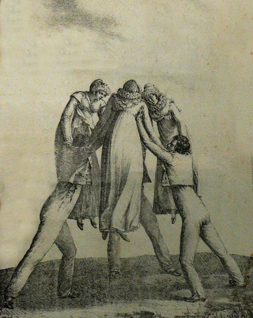Lorsque ceci a lieu, elles répètent la même figure qui se reproduit tant que dure chaque ball. En outre de la cama-rodona, il y a un autre saut qui demande de la part du cavalier, la même adresse et quelque force. La danseuse s’avance vers lui, elle place la main gauche dans la droite, qu’il lui tend, un triple élan est alors donné à ces deux mains réunies, et la danseuse raidissant le bras gauche et s’appuyant de la droite sur l’épaule de son danseur, s’élance pendant que celui-ci la soulève et l’assied sur sa main. Avant de la remettre à terre, il fait deux ou trois pirouettes en la tenant ainsi[3].»