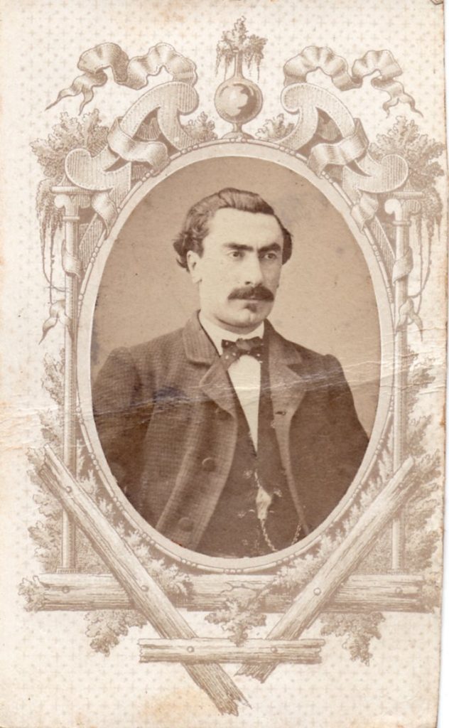 Artisan, Emile Lequin était horloger-bijoutier à Perpignan. Le complet-veston s’est imposé chez les hommes à partir du Second Empire, mais la plupart des Roussillonnais portent encore la redingote. On notera le très beau nœud de cravate ainsi que la chaine giletière pour la montre.