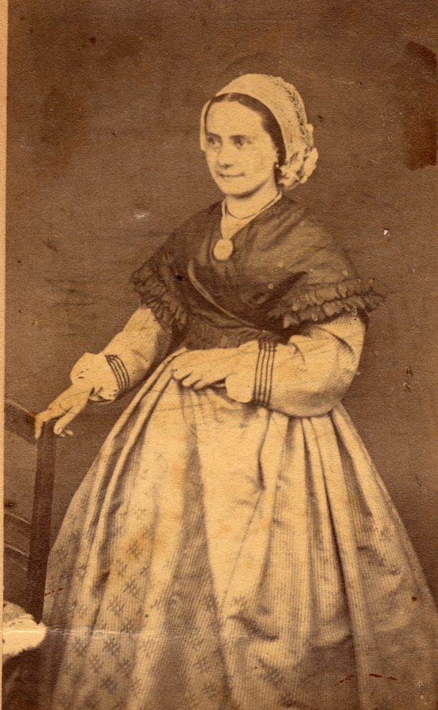 Photographiée à Marseille lors d’un voyage, cette femme d’âge respectable porte un très grand châle à franges ainsi que la coiffe catalane. La robe de grande ampleur et le caraco à manches pagodes et manchettes de mousseline laissent percevoir l’usage de mitaines. Enfin, nulle catalane ne saurait voyager sans un éventail.