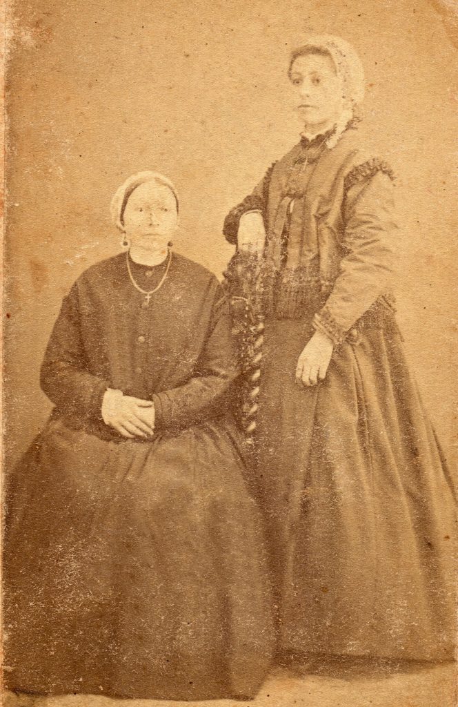 Étrange pour nos yeux contemporains, le costume de grand deuil des femmes aisées et très âgées est très bien représenté sur ce portrait. Les coiffes de deuils des modistes étaient mises en volume avec des fils de laiton recouverts de soie, fleurs noires et chantilly noire en grande quantité. Leur volume et leur poids obligeait à les serrer par de gros rubans sous le menton.