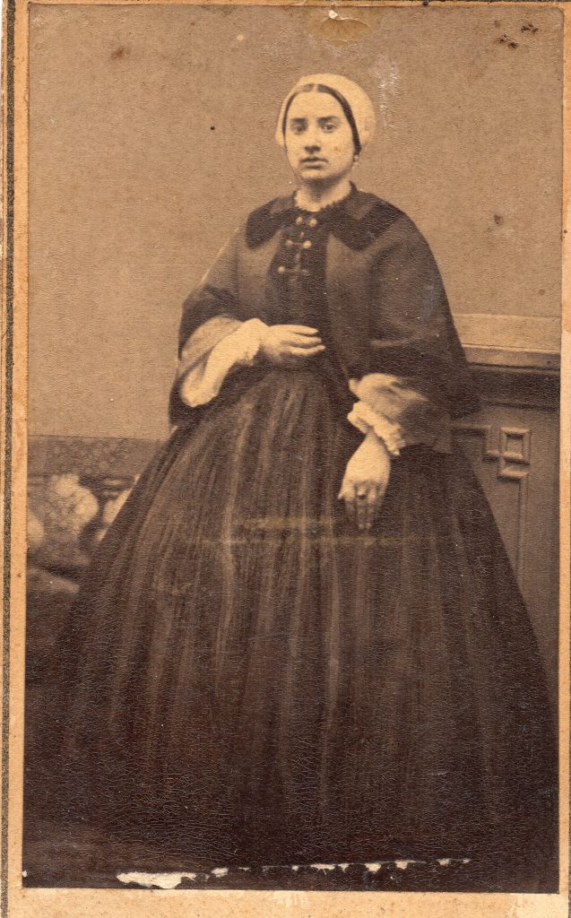 La simplicité de a mise de cette jeune femme nous permet de bien apprécier l’ampleur que la crinoline pouvait donner. A Perpignan on a surtout porté le modèle rond, avec jupon plat devant, plus pratique que la crinoline à volume projeté en arrière. Nous pouvons voir les plis sur le devant qui permettent l’ampleur, ainsi que la ceinture en losange qui resserre la taille.