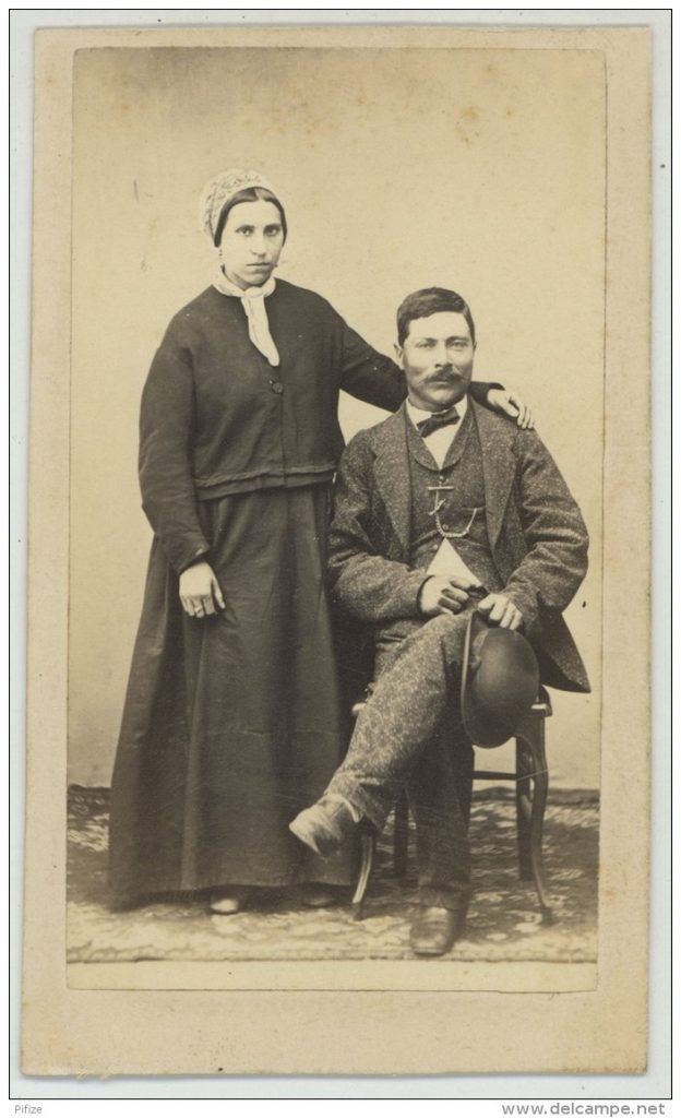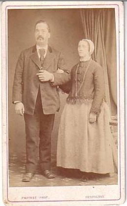 Il s’agit d’un gendarme en costume d’apparat et de son épouse. La vie militaire de Perpignan n’est plus à démontrer pour cette ville frontalière de garnison. Ici l’épouse porte un magnifique châle carré en laine cachemire, probablement de la ville de Nîmes où ce genre d’article était fabriqué. La coiffe est parée, le châle est arrêté par une broche. La crinoline est ronde. Il est à noter pour ce costume l’absence de tablier d’apparat.