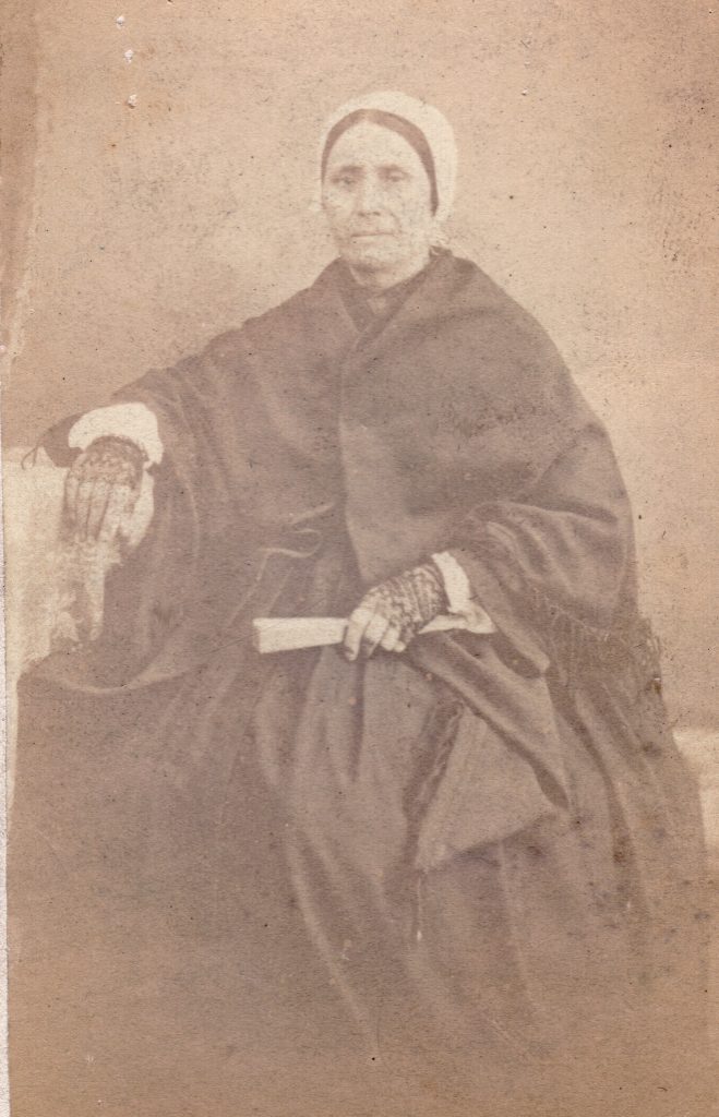 Photographiée à Marseille lors d’un voyage, cette femme d’âge respectable porte un très grand châle à franges ainsi que la coiffe catalane. La robe de grande ampleur et le caraco à manches pagodes et manchettes de mousseline laissent percevoir l’usage de mitaines. Enfin, nulle catalane ne saurait voyager sans un éventail.