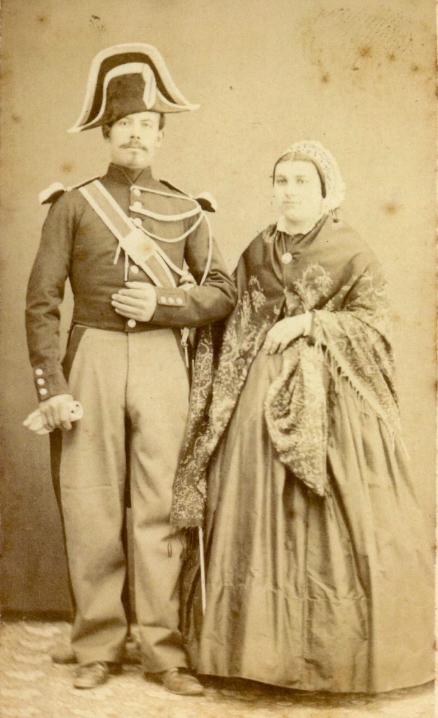 Il s’agit d’un gendarme en costume d’apparat et de son épouse. La vie militaire de Perpignan n’est plus à démontrer pour cette ville frontalière de garnison. Ici l’épouse porte un magnifique châle carré en laine cachemire, probablement de la ville de Nîmes où ce genre d’article était fabriqué. La coiffe est parée, le châle est arrêté par une broche. La crinoline est ronde. Il est à noter pour ce costume l’absence de tablier d’apparat.