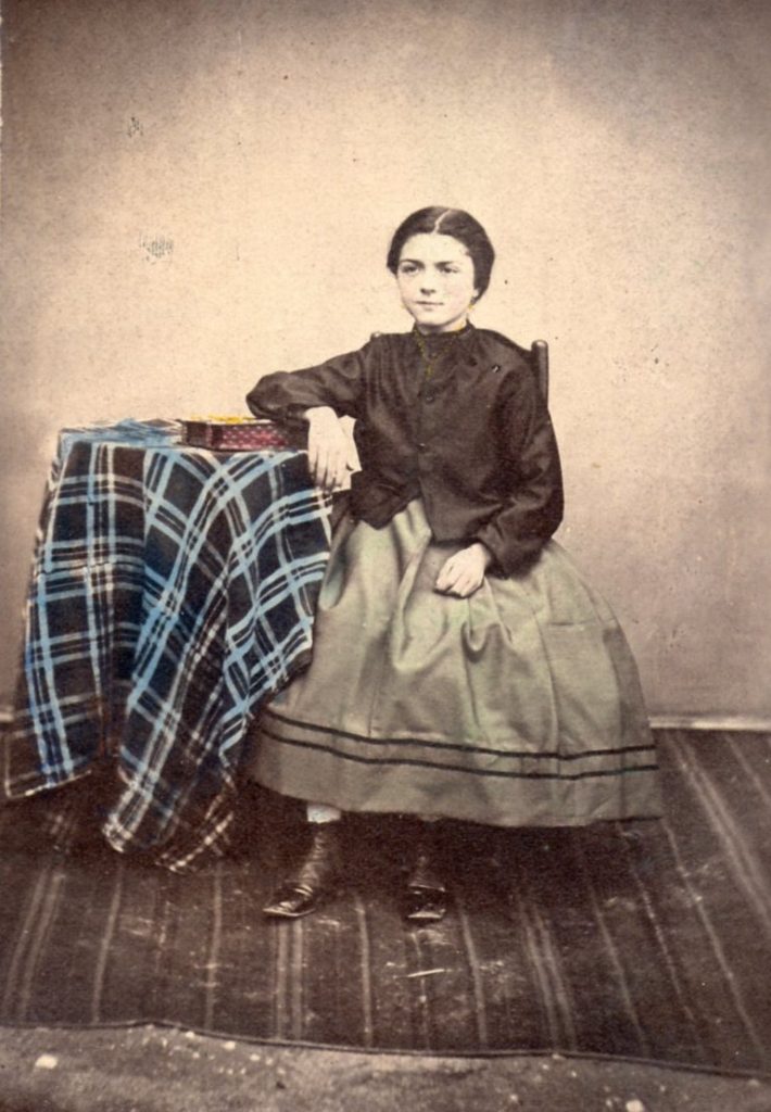 Ce portrait mis en couleur permet d’apprécier le costume de jeune fille. Elle porte elle aussi une petite crinoline sous sa jupe courte, verte à motif de deux lignes noires en ruban de velours. Elle porte en dessous un pantalon de lingerie qui s’arrête aux bottines. Le caraco noir est lâche, non resserré à la taille.