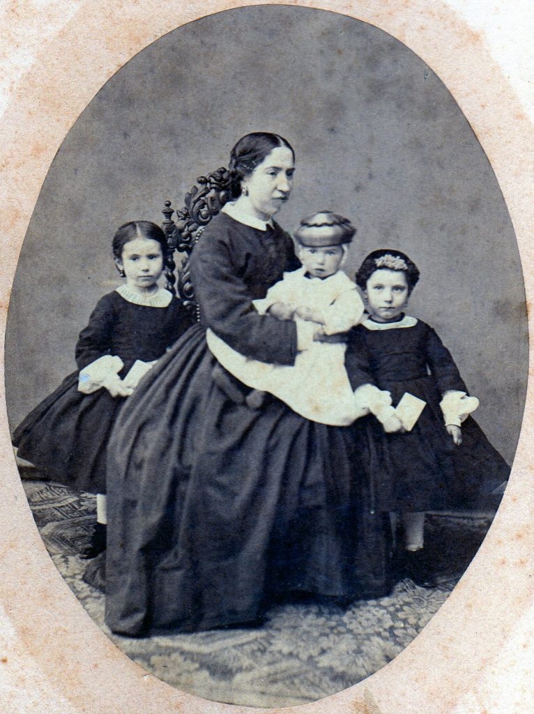 Cette jeune mère est assise avec son dernier né sur les genoux et ses deux filles de part et d’autre. Elle ne porte ni coiffe ni châle. Les deux filles portent sensiblement la même robe d’enfant, à jupe courte et pantalons avec caraco à manches terminées par des manchettes bouffantes. Le petit garçon arbore sur sa tète un chapeau de paille tressée qui le protégera des chutes.