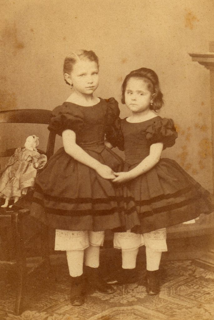 Deux petites filles de la bourgeoisie commerçante de Perpignan avec deux robes à manches courtes identiques. Les robes de petites filles se portaient avec bas et pantalons apparents.
