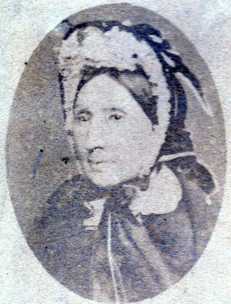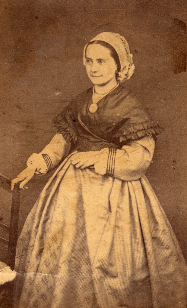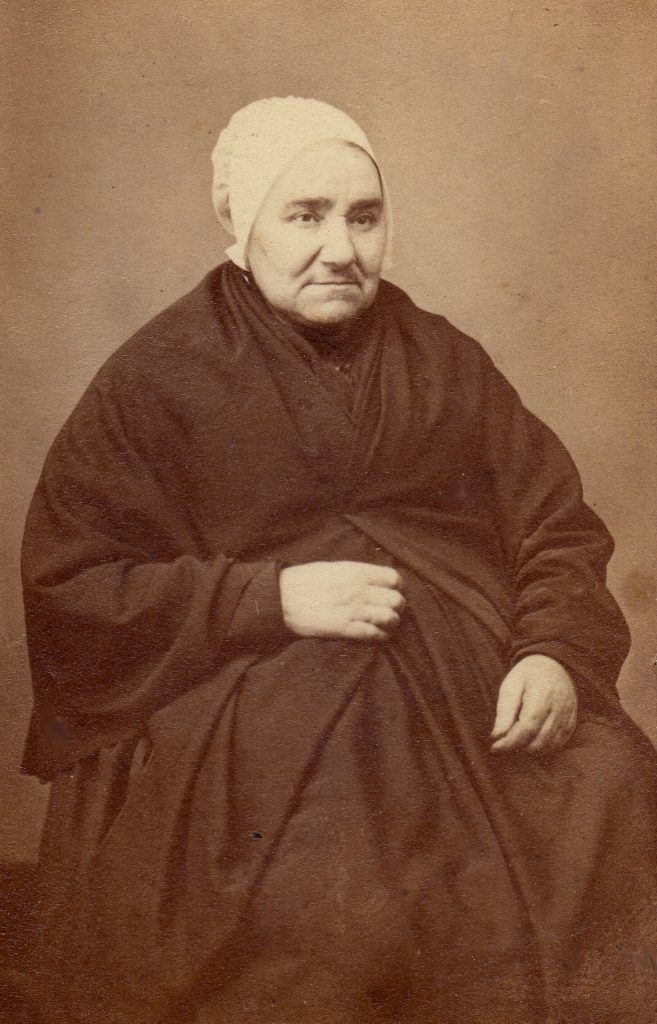 Sur ce portrait très altéré, cette épouse d’un maître de forges, née en 1801, est à la fin de sa vie une personne distinguée qui porte une coiffe capote en rubans et dentelles dans le plus pur goût napoléon III.
