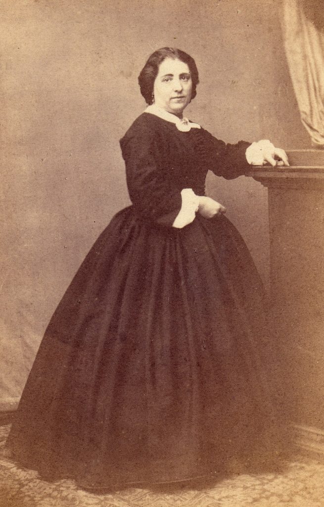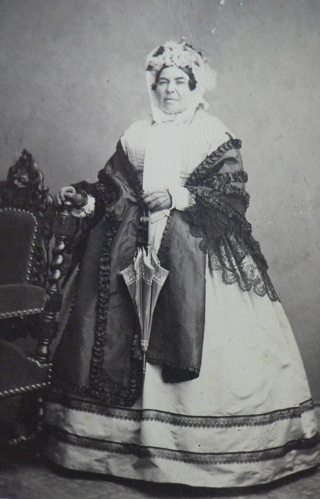 Très belle pose pour cette épouse au petit châle en pointe, en dentelle noire. Elle ne porte pas de coiffe. La taille est amincie par un corset. Il ne semble pas que le volume soit du à des cerceaux d’acier, mais plutôt à un assortiment de nombreux jupons amidonnés.