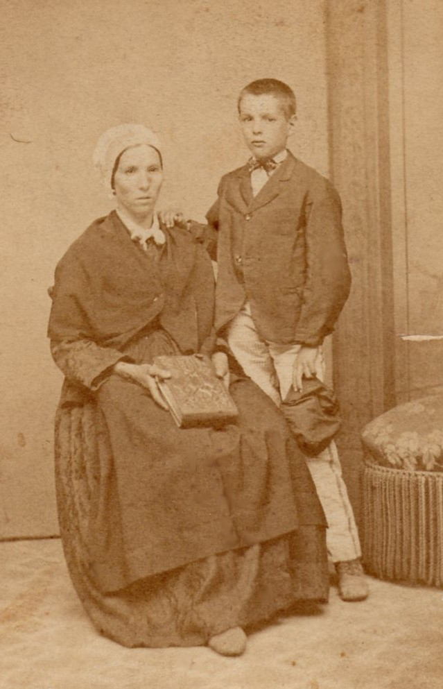 Il est intéressant de remarquer la vêture toute traditionnelle de cette mère avec coiffe, châle et tablier, ainsi que le joli motif moiré de la robe.